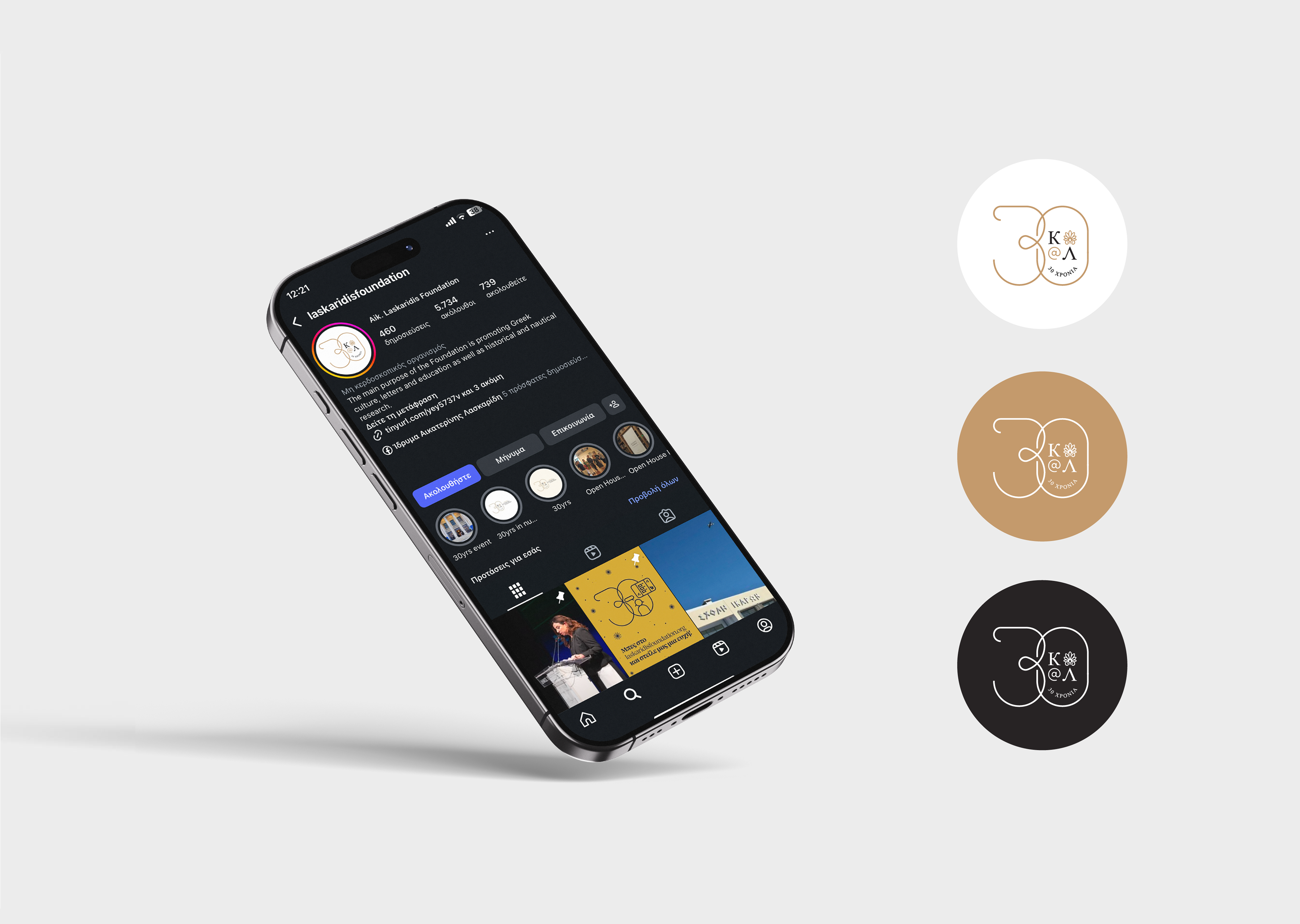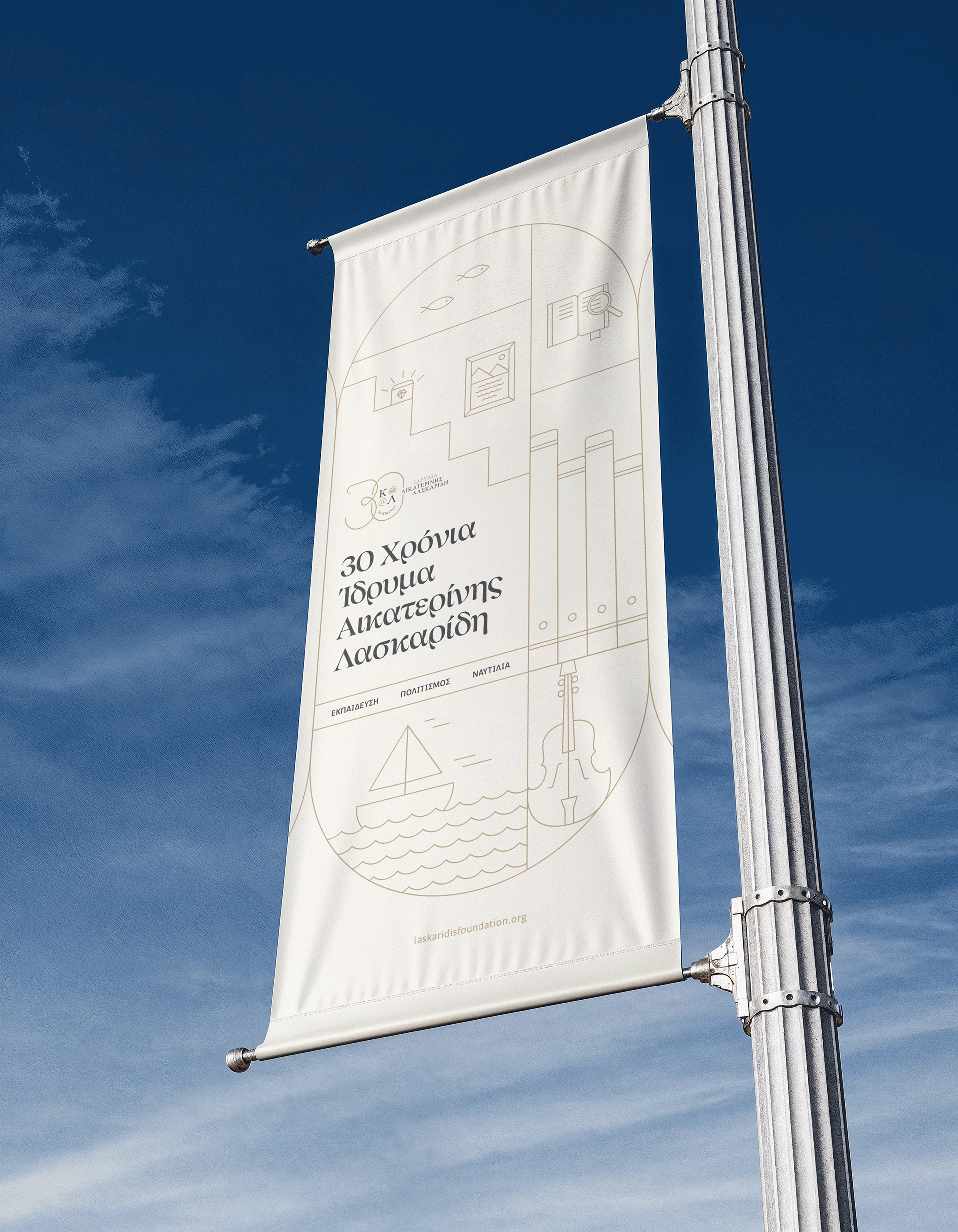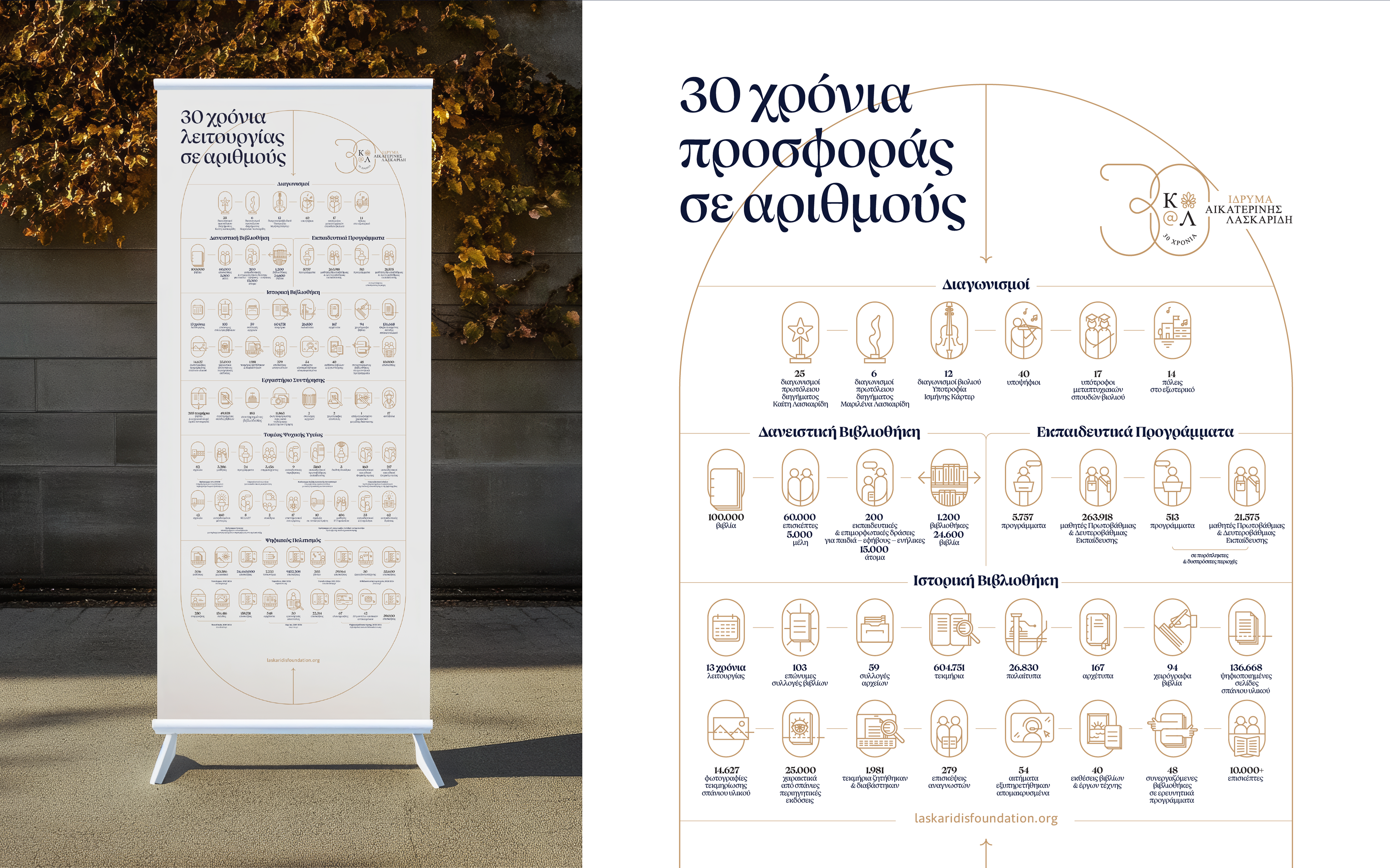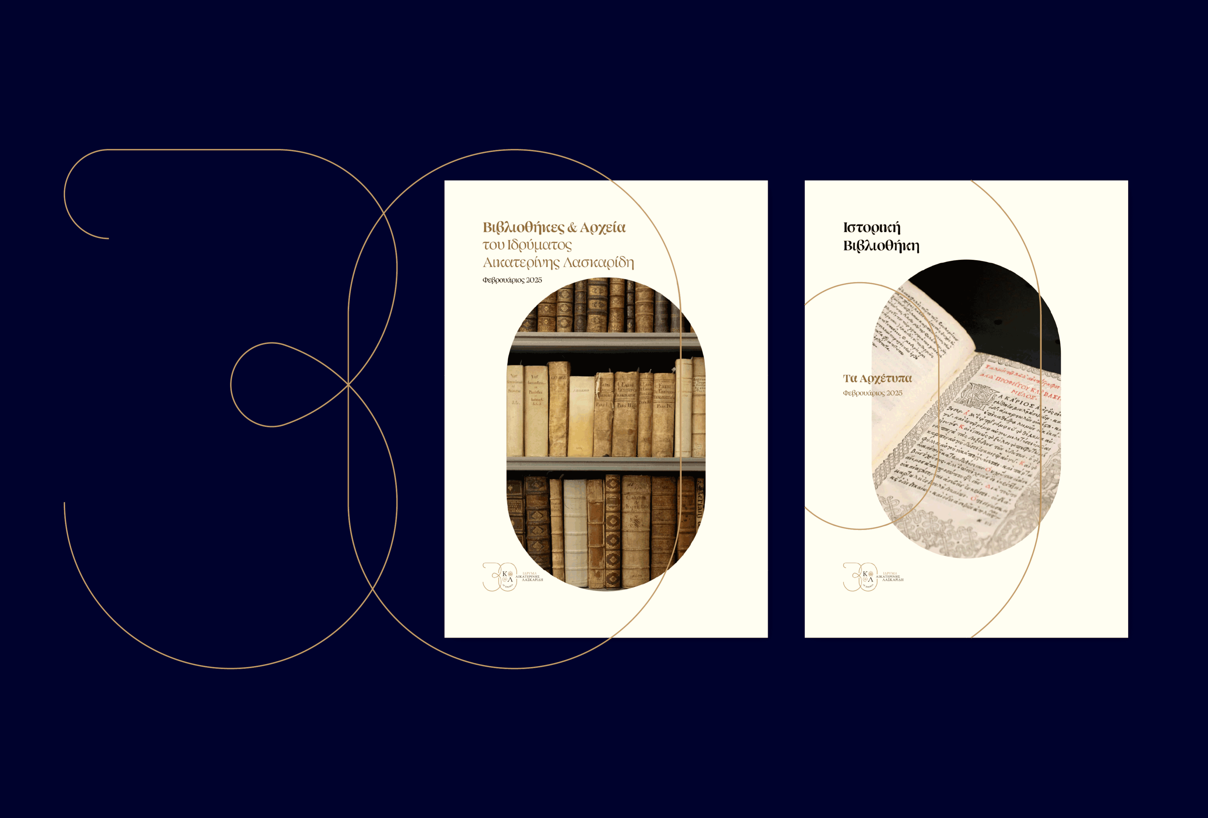 Για τον εορτασμό των 30 χρόνων δράσης και προσφοράς του Ιδρύματος Αικατερίνης Λασκαρίδη δημιουργήθηκε μια ολοκληρωμένη επετειακή οπτική ταυτότητα. Η ταυτότητα περιλαμβάνει τον σχεδιασμό ειδικής λογοτύπησης για το 2025, η οποία συνοδεύει όλο το επικοινωνιακό υλικό των εορταστικών δράσεων, καθώς και μια σειρά από αναλογικές και ψηφιακές εφαρμογές. Πέρα από το επετειακό λογότυπο, σχεδιάστηκαν έντυπα για τις ανάγκες της Ιστορικής Βιβλιοθήκης, μια εκτενής σειρά εικονογραμμάτων (icons) που καλύπτουν όλα τα τμήματα του Ιδρύματος, καθώς και πλήθος οπτικών εφαρμογών για δύο σημαντικές εκδηλώσεις:
