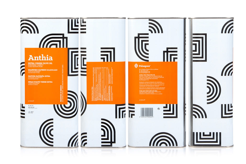 Anthia Extra Virgin Olive Oil, a new product line by Pelasgaea S.A. from olive groves of the region of Fthiotida. In the fertile lands of ancient Fthia, birthplace of the Pelasgians, land of Achilles, known since antiquity for its quality cultivation and production of olive trees, are located our privately owned olive groves. This is a different range than the other premium Extra Virgin Olive Oil, Anthia products and it’s goal is to be sold wholesale in restaurants and ships. For the packaging design we came up with a simple square grid that it’s filled with elements that comes from the companies graphic identity. The typography is placed in black boxes in order to stand out. All work is printed in one single pitch black ink to reduce the cost of production. It comes on 3 sizes, 1Lt, 3Lt and 5Lt and a small 100ml that comes as sample. In 2015 a Koroneiki Variety 5Lt, whit the orange stripe, was added to the family.
