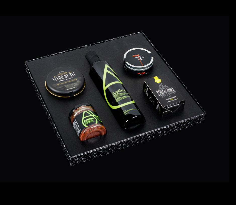Following the brand guidelines of Pelasgaea and Pelasgaea Deli, we've created a special gift box for their premium customers. The box holds a 500ml Anthia Exrta Virgin Olive Oil, Anthia Olive Paste, Notio Leaf tea (also designed by our studio) a great honey and a lovely sea salt tin can. Everything is based on the "leaves and seeds" pattern. The company logo is printed with sliver foil and we also added an orange belt for the extra contrast but also for security reasons as the final box weights more than 3,5kg.