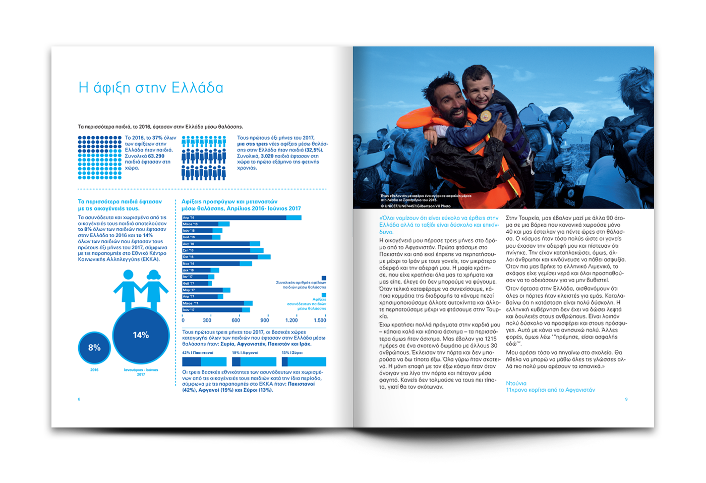 Unicef invited us to design a booklet with infographics in two languages, Greek and English. The number of children moving across international borders – more and more of them on their own – is skyrocketing. In Europe alone, the number of children seeking asylum multiplied almost 10-fold between 2008 and 2016, while the share of children among asylum seekers grew from one in five to one in three. As of 2015, 31 million children were living outside their country of birth. Since the same year, a large number of uprooted children have also been crossing the Greek borders, driven by hunger, conflict, violence and severe poverty.
