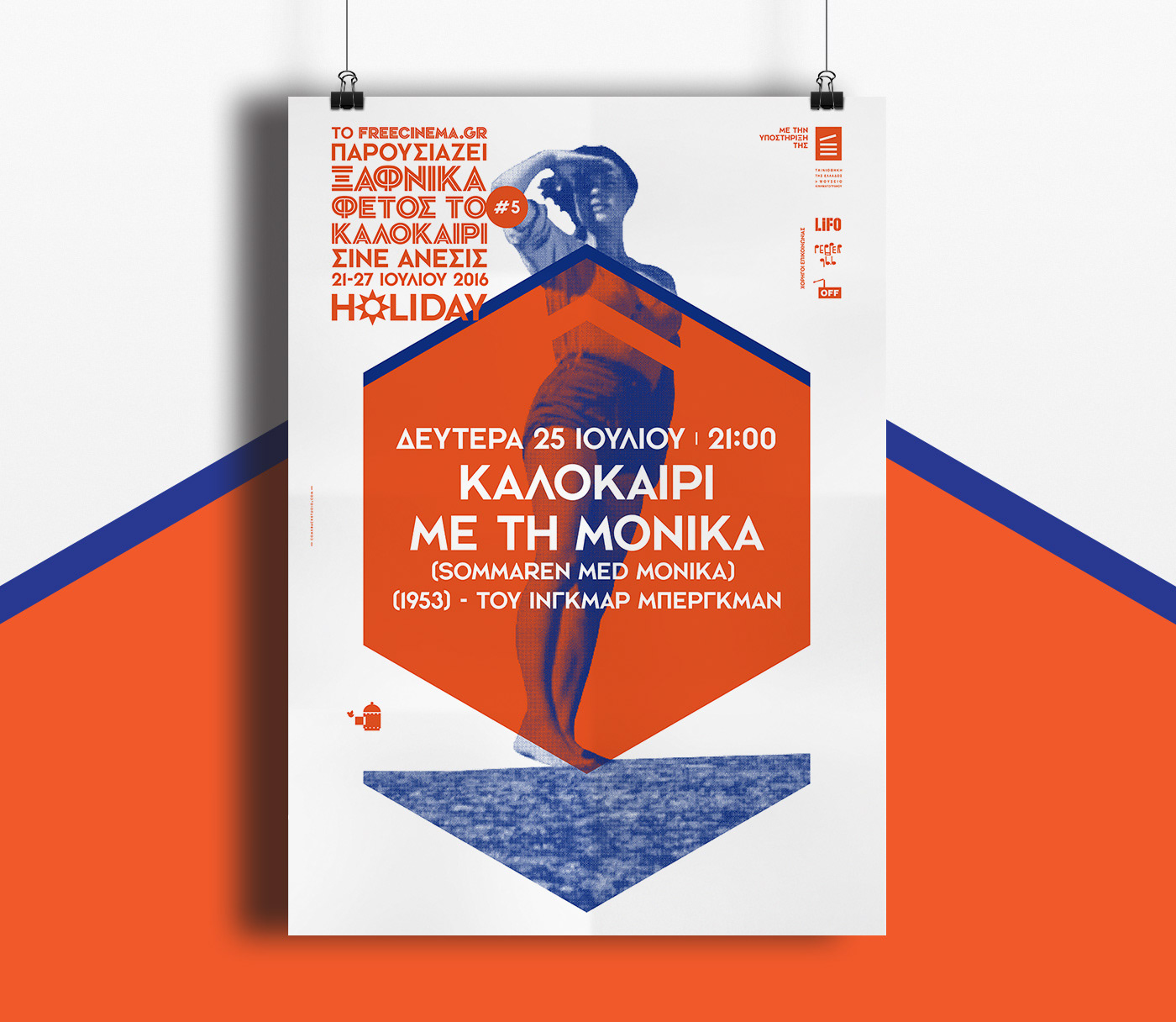 One week. Fourteen movies, all about summer. The concept for the design of the movie posters, this year was, to design simple geometric compositions with high contrast. Monotone pictures, two colour, geometric shapes and the free cinemas' custom typography. We've also designed posters for the same film tribute in the past.