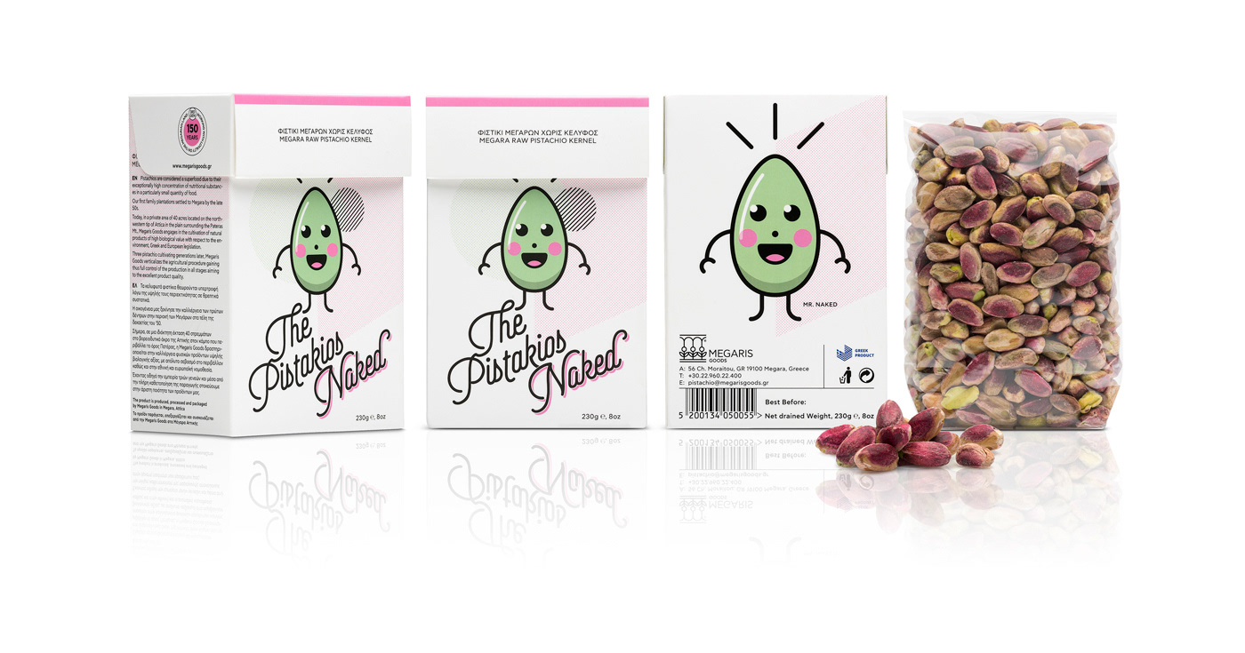 Σχεδιάσαμε μια οικογένεια από χαρακτήρες και φίλους. Με αρχηγό τoν Mr. Raw, οι φίλοι του, ο Mr. Lemon και ο Mr. Salt εικονογραφούν σε συνδιασμούς την κάθε συσκευασία. Για την ψίχα φιστικίου, έχουμε τον Mr. Naked που είναι και ο πιο ντροπαλός της παρέας. Το κουτί είναι σχεδιασμένο με τέτοιο τρόπο ώστε να μπορεί κάποιος να βάλει το χέρι του μέσα και να πάρει "μια χούφτα" φιστίκια καθώς επίσης να ξανακλείσει το κουτί έτσι ώστε το προϊόν να μείνει φρέσκο, μιάς και τα 230gr θα τα κατανάλωσει κάποιος σε δύο δόσεις.